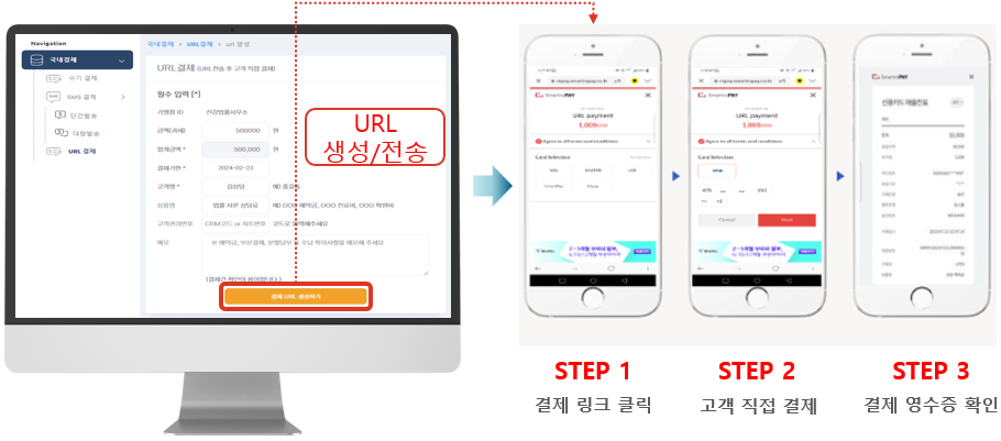 수기결제, SMS결제, URL결제 등 다양한 결제 수단을 통해 고객이 직접 방문하지 않아도 단말기 없이 인터넷만 가능하면 언제 어디서든 PC와 모바일에서 쉽고 편리하게 결제를 받을 수 있는 무방문•비대면 결제 솔루션 입니다.